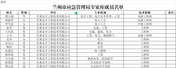 •   近日,從蘭州市應(yīng)急局發(fā)布的《關(guān)于蘭州市應(yīng)急管理專家?guī)鞌M入庫(kù)專家的公示》獲悉,通過嚴(yán)格遴選,公平考核等多個(gè)程序,甘肅安卓工程技術(shù)有限公司共有14名同事被納入蘭州市應(yīng)急管理專家?guī)臁?/span>