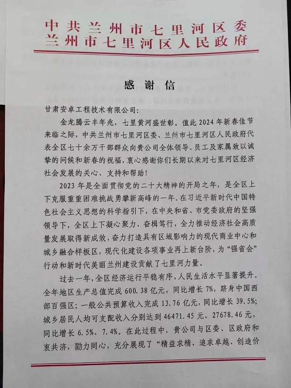 在這封充滿溫馨問(wèn)候和新春祝福的感謝信中,中共蘭州市七里河區(qū)委與蘭州市七里河區(qū)人民政府對(duì)甘肅安卓過(guò)去一年的工作表示了認(rèn)可與感謝。他們提到,甘肅安卓以“精益求精、追求卓越、創(chuàng)造價(jià)值”為準(zhǔn)則,在推動(dòng)全區(qū)改革發(fā)展方面默默付出,為區(qū)域經(jīng)濟(jì)社會(huì)的高質(zhì)量發(fā)展做出了自己的貢獻(xiàn)。同時(shí),甘肅安卓的努力也為七里河區(qū)現(xiàn)代化建設(shè)各項(xiàng)事業(yè)的穩(wěn)步提升提供了助力。區(qū)委、區(qū)政府在信末送上了新年的美好祝愿,期望甘肅安卓未來(lái)繼續(xù)發(fā)揮引領(lǐng)作用,為七里河區(qū)乃至全市的繁榮與進(jìn)步貢獻(xiàn)更多力量。