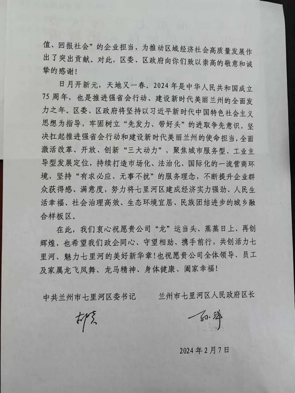 歲末年關(guān),新春將至。近日,中共蘭州市七里河區(qū)委、蘭州市七里河區(qū)人民政府發(fā)來(lái)感謝信。