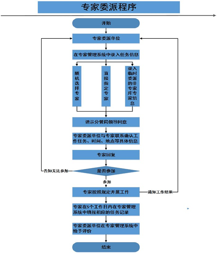(一)委派專家任務(wù)的單位(省安監(jiān)局機(jī)關(guān)有關(guān)處室、單位,以下簡(jiǎn)稱專家委派單位)應(yīng)根據(jù)任務(wù)需要,在專家管理系統(tǒng)中錄入任務(wù)相關(guān)信息,從專家?guī)熘须S機(jī)選擇專家,特殊情況可直接指定專家;專家?guī)鞂<也荒軡M足任務(wù)需要時(shí),專家委派單位在請(qǐng)示分管局領(lǐng)導(dǎo)同意后,可委派專家?guī)熘獾膶<覉?zhí)行委派任務(wù),并在專家管理系統(tǒng)中錄入臨時(shí)委派任務(wù)的專家信息;